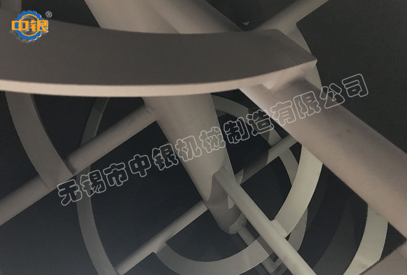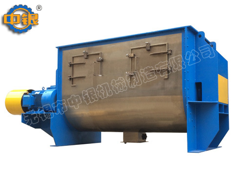 臥式螺帶混合機(jī)以高效、快速混合物料、由攪拌軸的螺旋帶運(yùn)動(dòng)下,使內(nèi)外螺旋帶在較大范圍內(nèi)翻動(dòng)物料,內(nèi)螺旋帶將物料向兩側(cè)運(yùn)動(dòng),外螺旋帶將物料由兩側(cè)向內(nèi)運(yùn)動(dòng),使物料來(lái)回滲混,另部分物料被螺旋帶推動(dòng)下,沒(méi)軸向徑向運(yùn)動(dòng),從而形成對(duì)流循環(huán)。由于上述運(yùn)動(dòng)的攪拌,物料在較短時(shí)間內(nèi)獲得快速均勻混合。